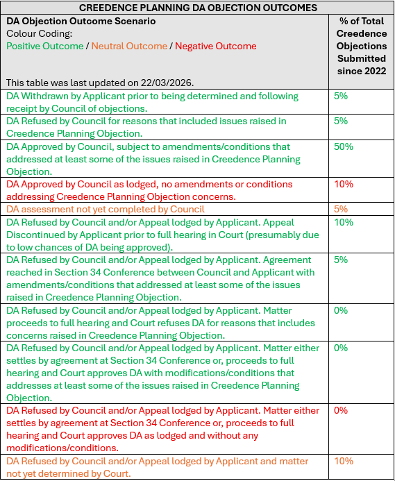 Outcomes of Creedence Planning Objections